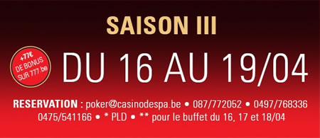 Pour participer à la troisième saison des Sit and Go 777.be, il vous suffit d'envoyer votre réservation à l'adresse « poker@casinodespa.be ». Ne tardez pas, car il n'y a de la place que pour 210 participants.